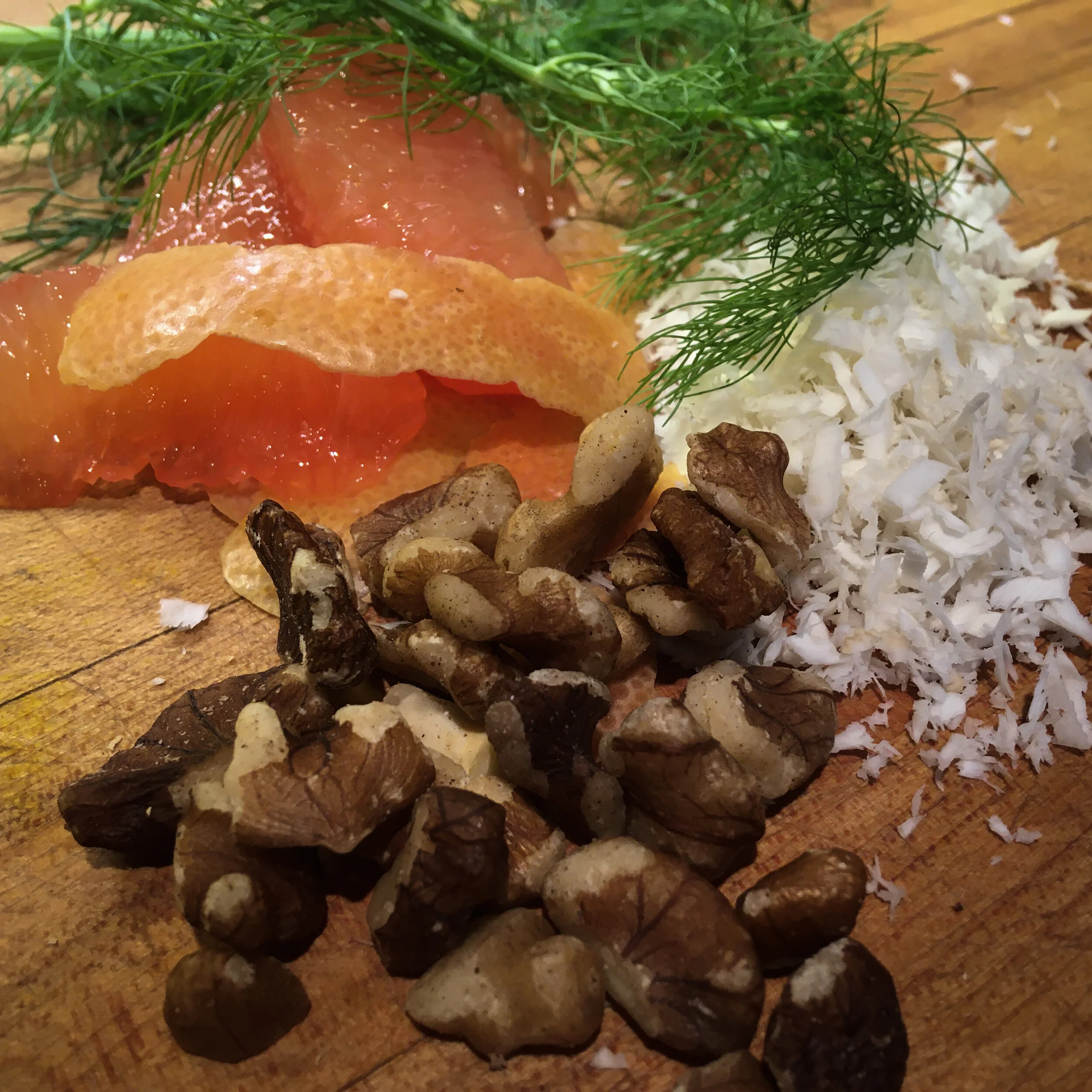 Make the dressing. Combine yogurt, mayonnaise, ½ & ½ in a bowl. Whisk to mix. Add grated horseradish root to the apple cider vinegar. Allow this to sit for 10 minutes, then whisk into the yogurt mixture. Whisk in the black walnut oil, the grapefruit zest, and black pepper.Mix together the two radicchios in the bowl with the dressing, toss well. Just prior to serving, toss in the grapefruit sections and the black walnuts. Portion on four plates, season with the coarse salt, and garnish with the black walnuts.